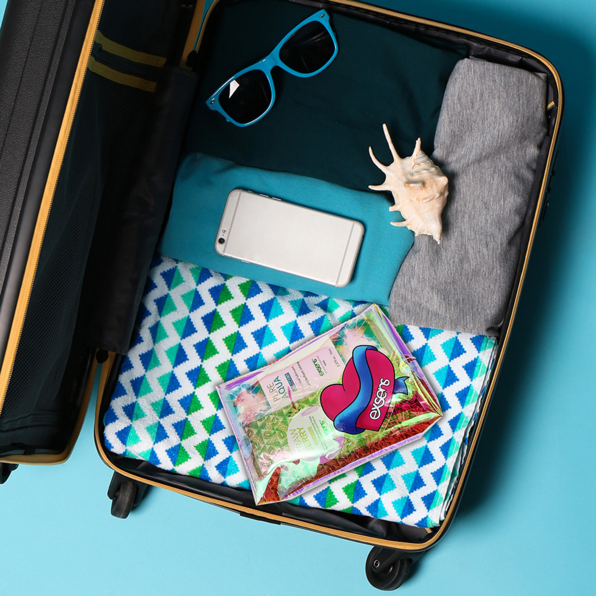 Everything you need for your next romantic getaway in one cute little kit bag. Inside you’ll find a full-sized tube of Pure Aqua water-based, vegan lubricant, one Hot Kiss Strawberry Arousal Lip Gel, six flavors of our yummy Gourmet Warming Intimate Massage samples, two condoms (because safe sex is the best sex), and a travel-ready bag to hold it all.