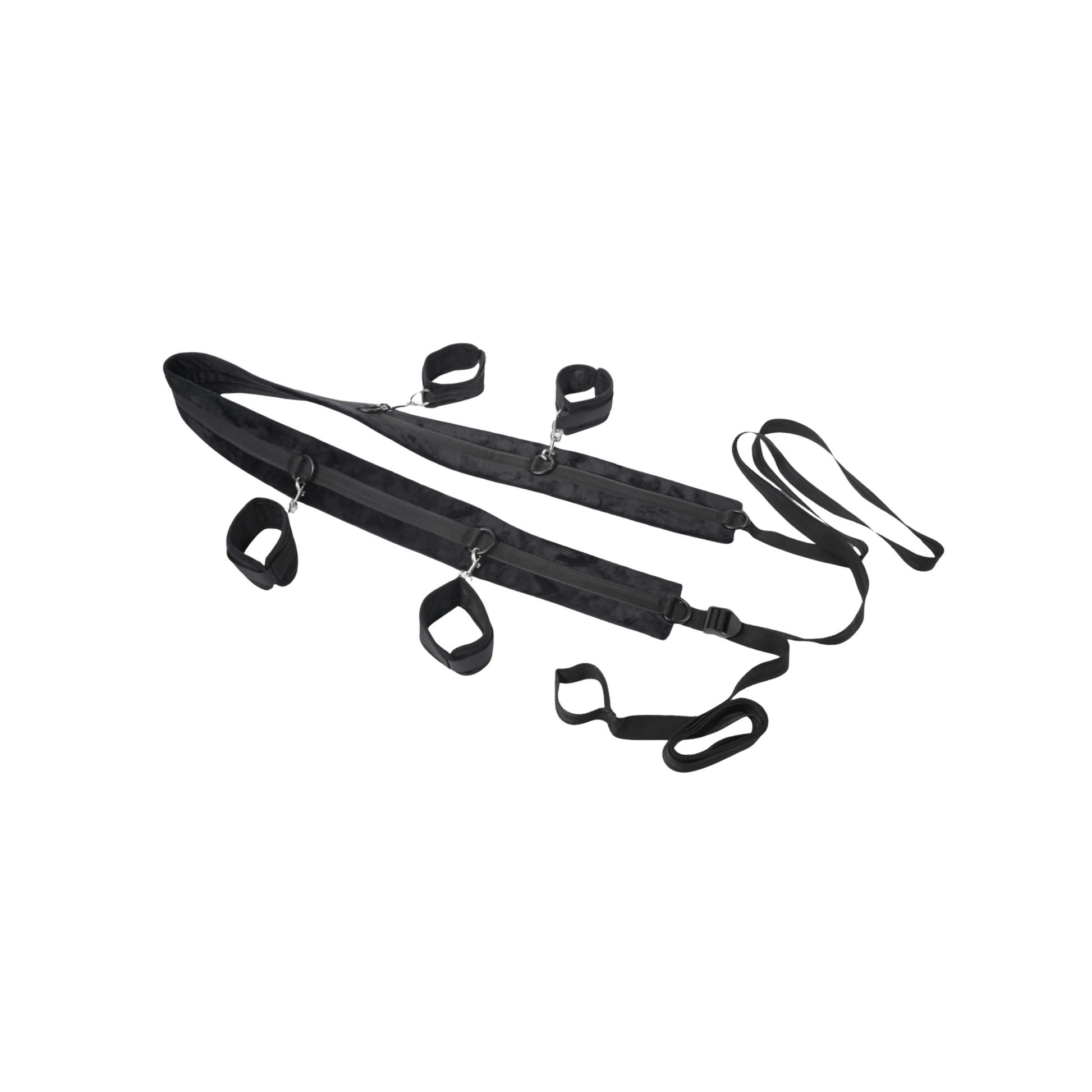 Surrender your body to entrancing restraints anywhere, anytime you want with the ultra-portable and adaptable No Matter Where Restraint System! Give your partner total control as you position yourself spread and restrained against the bed, or take your play to new heights by adjusting the straps to fit snugly against the door for standing bondage and tantalizing teasing. The possibilities are endless with the nearly 10ft of adjustable straps to tether your partner to anything you can imagine for the most erotic predicaments. Four included cuffs will keep them right where you want them in any position you like with the 6 D Ring connectors per strap stretched across 5ft of padded webbing.